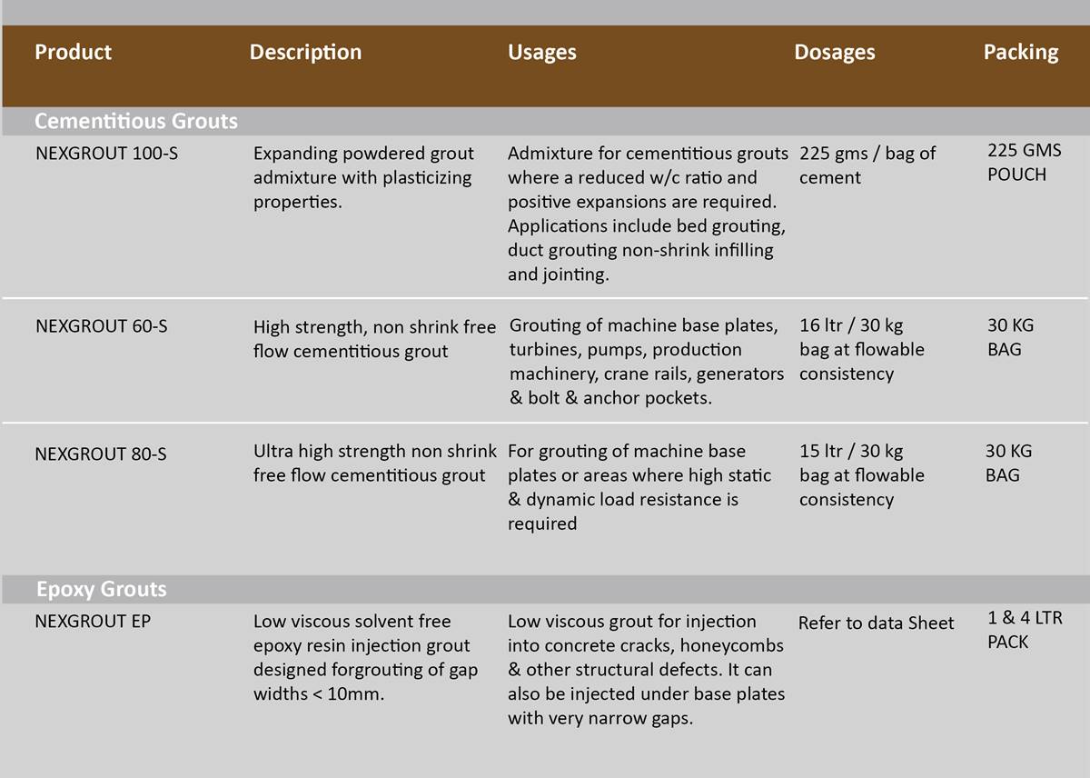 NEXAGROUT range of Cement and Resin based high efficiency products for heavy load bearing units and machinery baseplates along with anchoring systems to install permanent anchors and fixtures