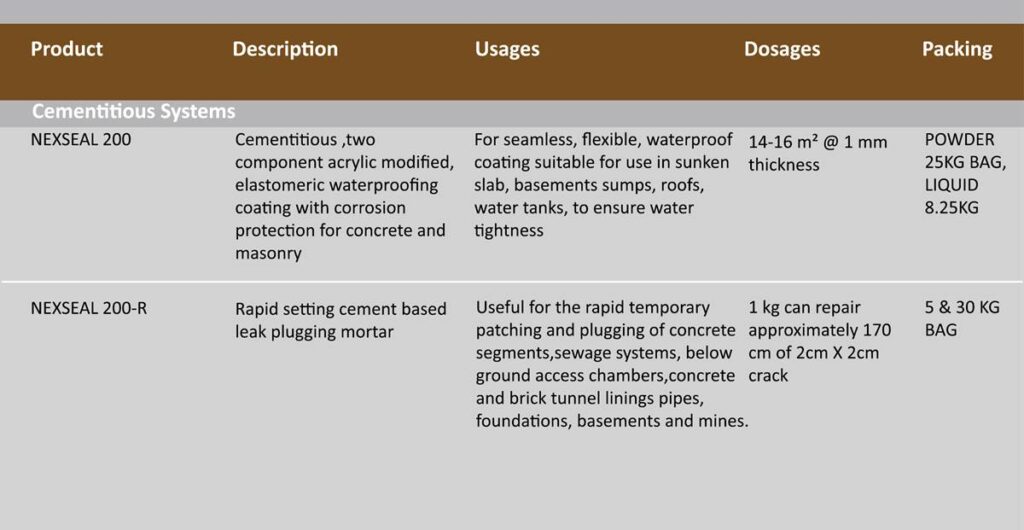 This includes entire range of different bases of coatings & membranes for waterproofing of below ground & above ground structures.